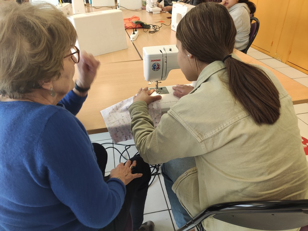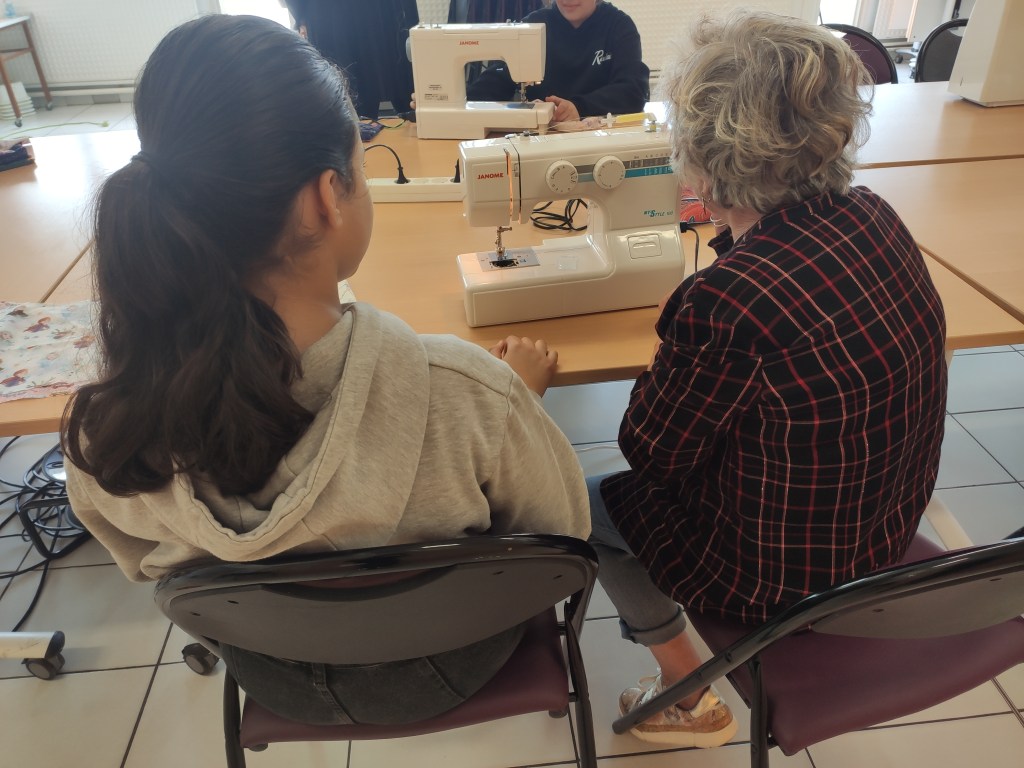 Des jeunes de l’EPJ (Equipement Polyvalent Jeunesse) sont venus au centre social apprendre l’utilisation de la machine à coudre. Apprentissage avec nos adhérentes couturières. Ensemble, elles ont réalisé une sacoche que les jeunes filles ont été très fière de ramener chez elle.