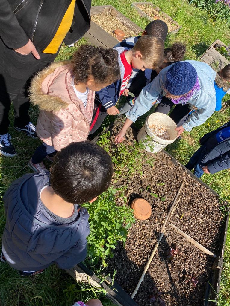 Durant les vacances de printemps, du 19 au 29 avril 2022, les enfant du centre de loisirs maternel « Les P’tits Loups » ont visité le jardin « du moulin vert ». Cécile et Chantal ont accueilli les enfants, leur ont fait découvrir les insectes, les plantes aromatiques et la mare pédagogique de ce beau jardin partagé du quartier !