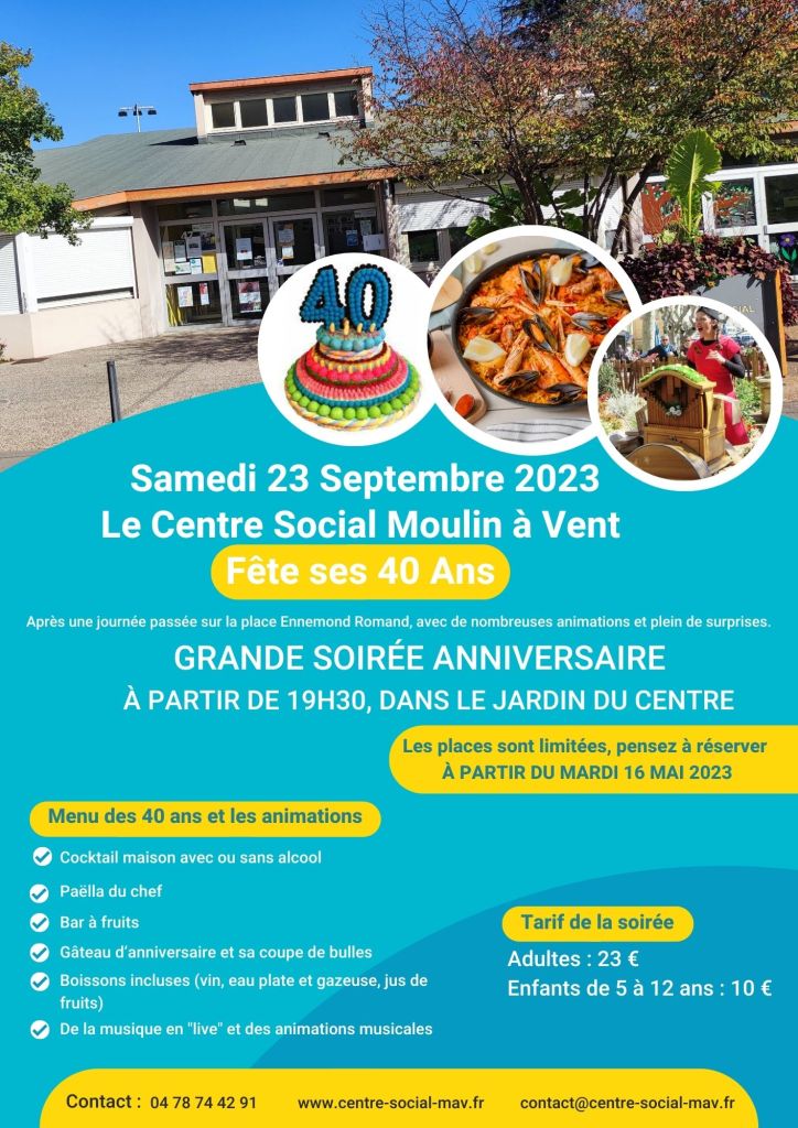 Le samedi 23 septembre 2023 le centre social Moulin à Vent Fête ses 40 Ans.