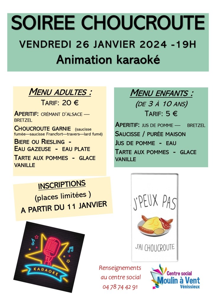 Rejoignez-nous pour une soirée choucroute gourmande suivie d’un karaoké festif au centre social le vendredi 26 janvier à partir de 19H .
