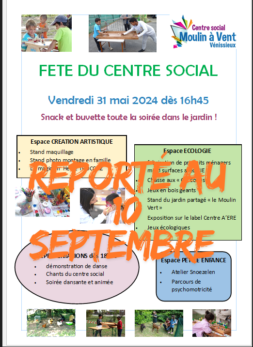 La fête du centre social prévue vendredi 31 mai est reportée au mardi 10 septembre.