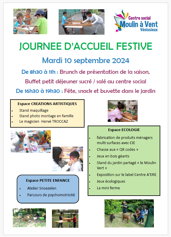 « Nous sommes ravis de vous accueillir à cette journée festive au Centre Social, un moment privilégié pour se retrouver, partager et découvrir ensemble toutes les activités passionnantes qui vous attendent cette année! »