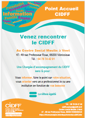 Le Centre d’information sur les Droits des Femmes et des Famille informe , oriente et accompagne le public , en priorité les femmes , dans les domaines de l’accès au droit , de la lutte contre les violences sexistes , de la création d’entreprise, de la sexualité et de la santé. Une chargée d’accompagnement vous accueille sur rendez-vous au 06 73 63 33 47, une fois par mois de 14h00 à 17h00 : 26 septembre , 8 octobre , 21 novembre , 16 décembre