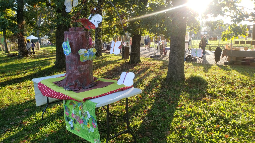 Une belle journée d’automne, notre oeuvre collective réalisée avec Marie Ballay et les tricoteuses pour leurs chenilles est maintenant exposée aux ateliers Briand à St Priest, puis à la maison de l’environnement !