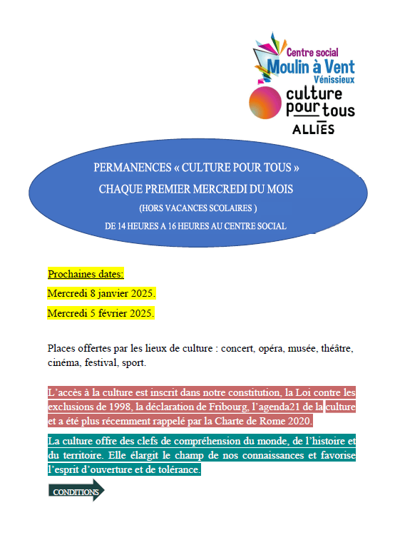 Permanence Culture pour tous Publié parcentresocial MAV4 février 2025Publié dans• Adultes - Familles, • Temps forts à venir Partager : Cliquer pour partager sur X(ouvre dans une nouvelle fenêtre) X Cliquez pour partager sur Facebook(ouvre dans une nouvelle fenêtre) Facebook J’aime chargement… Similaire