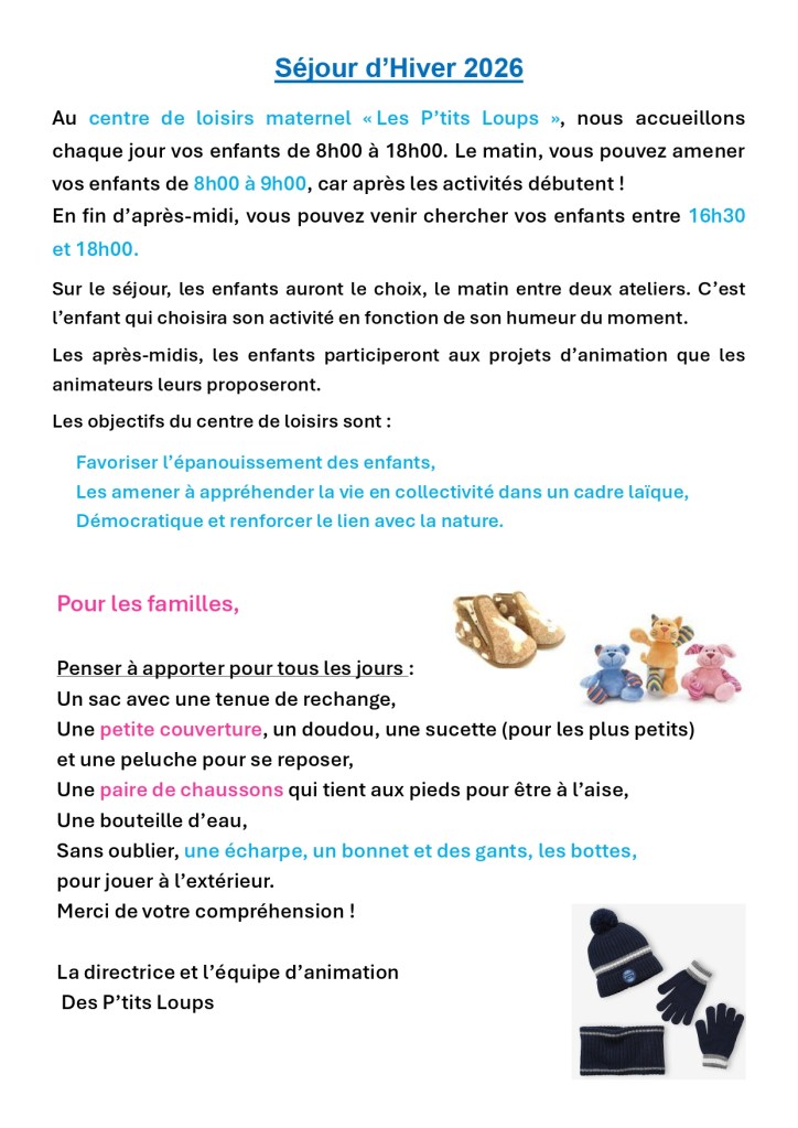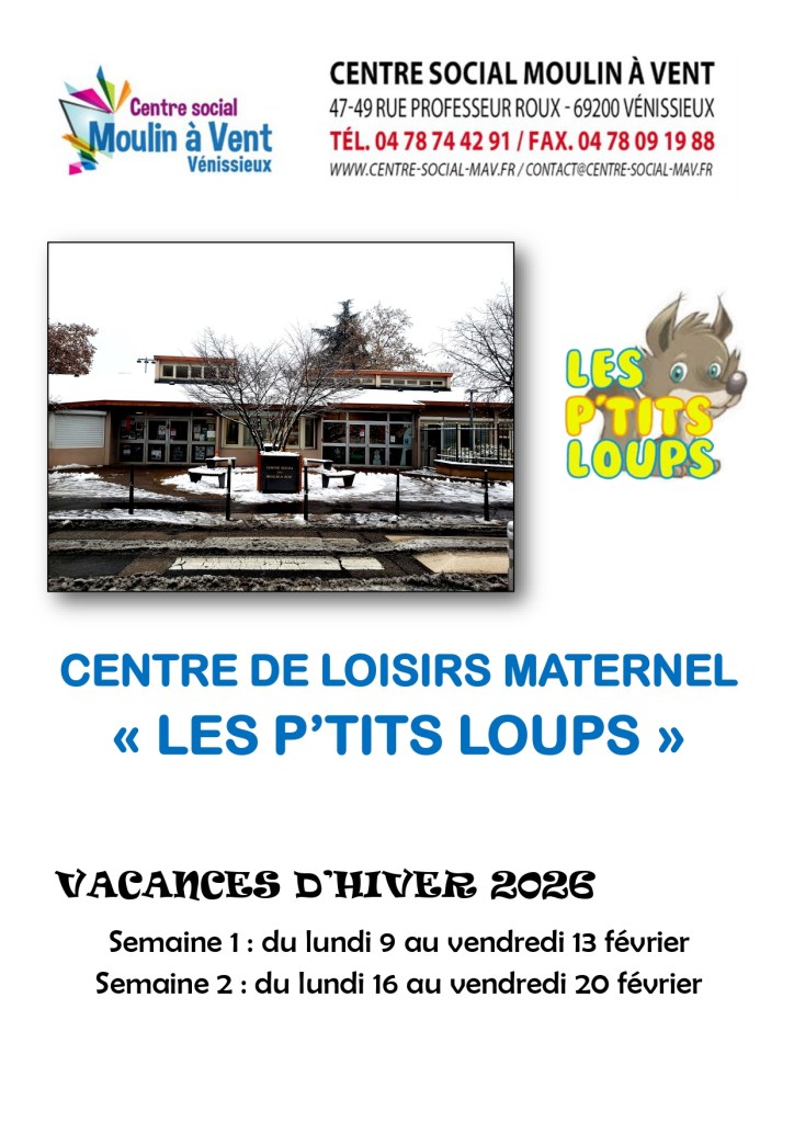 Les inscriptions «Les P’tits Loups» sont encore ouvertes pour les vacances d’hiver qui débutent très tôt cette année du lundi 9 février au vendredi 20 février. Pour plus d’informations et réservez une place pour votre enfant, appelez le numéro suivant: 06 61 48 38 69, puis venez à partir de 17h dans le hall d’entrée du centre.