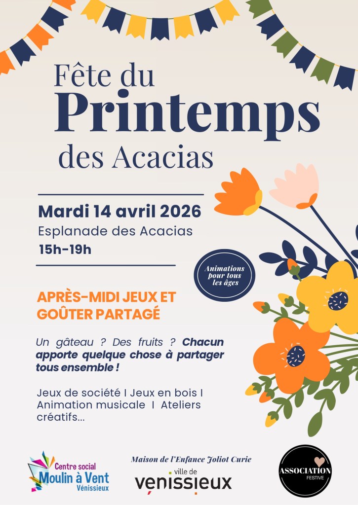Le Centre social Moulin à Vent, la Maison de l’Enfance Joliot Curie ainsi que l’Association Festive vous invitent à célébrer l’arrivée des beaux jours à l’occasion de la Fête du Printemps des Acacias, un moment convivial et festif entre habitants, familles et amis.